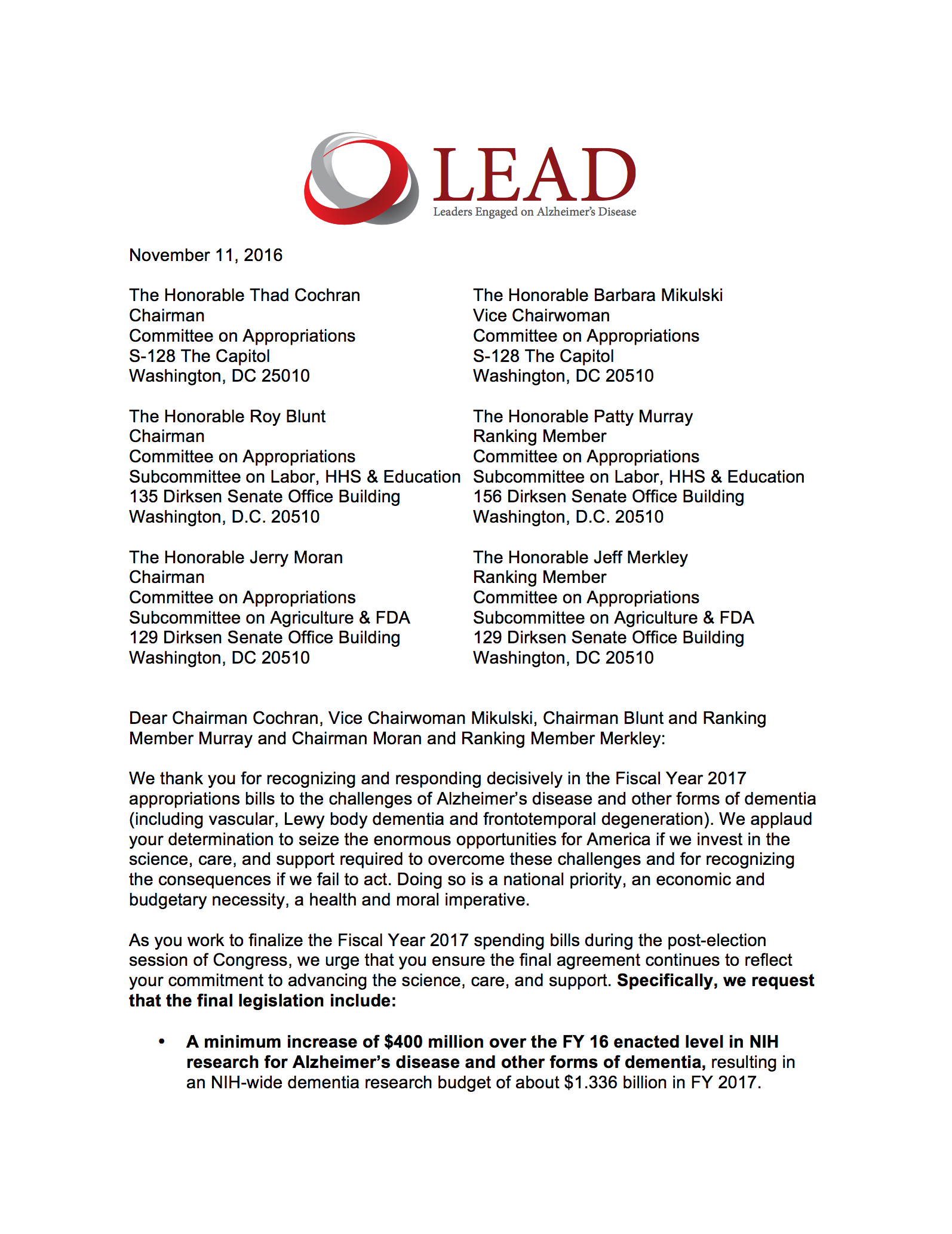 One hundred twenty six LEAD Coalition member organizations and supporters wrote to the U.S. House and Senate appropriations leadership calling for a Fiscal Year 2017 increase of at least $1 billion in dementia care, support, and research programs within the U.S. Department of Health and Human Services. Read the Senate and House versions of the […]